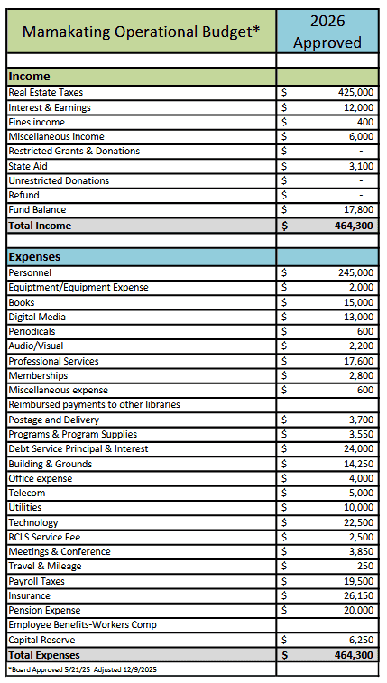 Mamakating Library Operational Budget